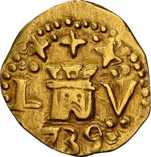 This specimen was lot 56 in Sedwick Auction 37 (Winter Park, FL, May 2025), where it sold for $12,000. The catalog description[1] noted, "PERU, Lima, gold cob 1 escudo, 1739 V, extremely rare, NGC AU 53, finest and only example in NGC census, ex-Almenara. Very broad flan with full details, particularly the bold assayer and date (a combination not listed in Calicó and KM), first example we have seen or heard of. Unlike the previous and succeeding lots, this appears to be a clean date, although the 9 was possibly re-punched. Pedigreed to the Almenara Collection (stated on label)." This type is recorded for 1702-45 and all dates are rare with tiny mintages. The Mexico City mint was converted to milled coinage in 1732-34 but Lima would not follow suit until 1751.