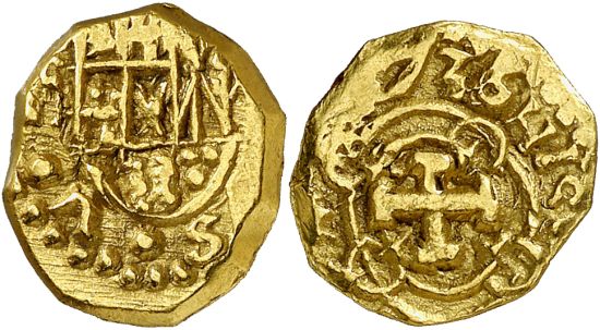 This specimen was lot 228 in Aureo y Calicó sale 448 (Barcelona, March 2025), where it sold for 3,000 € (about US$3,919 including buyer's fees). The catalog description[1] noted, "1735. Felipe V. Santa Fe de Nuevo Reino. (M). 1 escudo. Lions and castles. Visible part of the name and ordinal of the king. Very rare in this condition. EBC [extremely fine]." This type was struck at Bogotá in Colombia 1713-46 but few examples show dates. Numista lists 1713, 1715, 1722, 1728, 1732, 1735 (shown here), 1740 and 1744 and others exist.