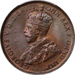 This specimen was lot 74295 in Stack's Bowers Collectors Choice Online Auction (Costa Mesa, CA, February 2025), where it sold for $3,120. The catalog description[1] noted, "AUSTRALIA. Penny, 1921. Melbourne or Sydney Mint. George V. PCGS MS-65 Red Brown. Variety with Indian obverse. Eminently Gem with brilliant surfaces that display a medley of electric blues, teals, and original mint red. Light notes of die cracks circle the obverse peripheral legends. From the Richard Margolis Collection." The silver coinage for Australia commenced in 1910 but bronze pennies and halfpennies were not struck until 1911. As such, none were struck with the effigy of Edward VII. This type was struck at the London mint 1911-15, at Heaton 1915, Calcutta 1916-18 and the Melbourne mint 1919-36 tho not all dates bear mintmarks. This date is common. Australia maintained the sterling silver standard until 1945, years after Great Britain had debased her coins to 0.500 fine.