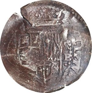 "BOLIVIA. Cob 8 Reales, 1651-P EE. Potosi Mint. Philip IV. PCGS Genuine--Chopmark, VF Details. A beautifully rustic 8 Reales Cob from the transitional period following the Potosi Mint Scandal of 1649. As such, it bears a crowned "L" countermark on the reverse, intended to revalue the piece at 7 1/2 Reales. There is also a small rectangular chopmark on the upper left quadrant of the cross, causing a bulge on the opposite side. Although the obverse is somewhat crude, the mintmark, denomination, assayer's initial, and part of the monarch's name all appear astride the central Habsburg shield. While the reverse date is mostly muddled, it can be ascertained thanks to the short duration of this design under the assayer Antonio de Ergueta. Fairly well-preserved and free from the commonly encountered die shift or saltwater damage, the coin presents its details with delightful boldness. Deep gunmetal toning enhances its eye appeal."