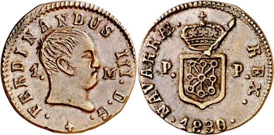 This specimen was lot 1605 in Aureo y Calicó sale 423 (Barcelona, December 2023), where it sold for 85 € (about US$110 including buyer's fees). The catalog description[1] noted, "1830. Fernando VII. Pampolona. 1 maravedí. Nice. Lovely color. Rare in this condition. EBC [extremely fine]." This type, struck 1829-33, is filed in the SCWC under Navarre, not Spain. Copper coinage was struck there 1818-33 in denominations of half, one, three and six maravedis.