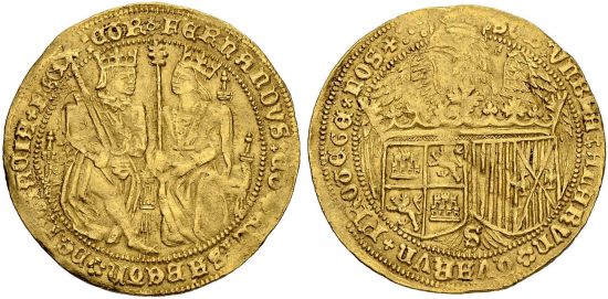 "SPAIN, Königreich, Fernando V. und Isabel I. 1474-1504 Doble Castellano o. J. (1475-1497). Sevilla . Von grösster Seltenheit. Sehr schön-vorzüglich. (kingdom of Spain, Ferdinand and Isabel, 1474-1504, undated double castellano, Seville mint. Of the highest rarity, Very fine-extremely fine.)"