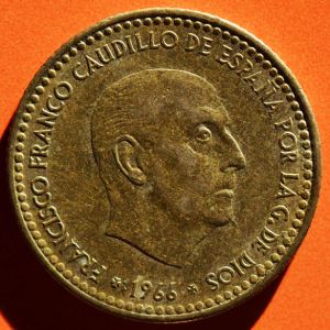 This coin, issued in the last years of the Franco regime (1939-75), is a descendant of the silver peseta issued in the late nineteenth century. This denomination was first issued in aluminum bronze in 1944 (KM 767) and featured a younger, pudgier portrait of Franco in 1948-67 (KM 775). This type was issued 1967-75 in large quantities. Although the coin is dated 1966, the true minting date is incuse in the stars on the reverse, where a tiny "74" can be spied. Spain was the only country to do this and abandoned this clumsy system after 1982, during the reign of Juan Carlos.