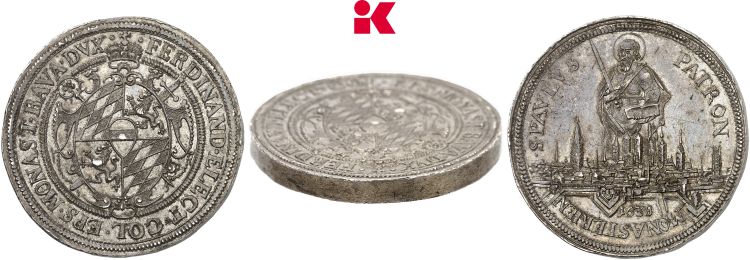 "DEUTSCHE MÜNZEN UND MEDAILLEN · MÜNSTER, BISTUM Ferdinand von Bayern, 1612-1650. Doppelter Reichstaler 1638, Münster. · FERDINAND · ELECT · COL · EPS · MONAST · BAVA · DVX : Gekröntes und verziertes, vierfeldiges Wappen (Bayern, Pfalz / Pfalz, Bayern) mit Mittelschild von Münster, dahinter Krummstab und Schwert gekreuzt//· S · PAVLVS · - · PATRON · - MONASTERIEN Stadtansicht, darüber Kniebild des Heiligen Paulus mit Schwert und Buch, unten die Signatur EK (Engelbert Ketteler, Münzmeister in Münster 1636-1661) und die Jahreszahl 1638. Von großer Seltenheit. Herrliche Patina, attraktives, vorzügliches Exemplar. Exemplar der Auktion Fritz Rudolf Künker 163, Berlin 2010, Nr. 581 und der Auktion Fritz Rudolf Künker 244, Berlin 2014, Nr. 220. (Germany, bishopric of Münster, Ferdinand of Bavaria, 1612-50, double thaler of 1638, Münster mint. Obverse: crowned and quartered arms of Bavaria and the Palatinate with the escutcheon of Münster, crossed crozier and sword behind; reverse: St. paul with book and sword behind a city view, date below. Extremely rare, handsome patina, attractive extremely fine example.)"