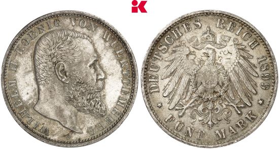 "DEUTSCHE MÜNZEN AB 1871 · REICHSSILBERMÜNZEN, WÜRTTEMBERG Wilhelm II., 1891-1918. 5 Mark 1899. Sehr selten in dieser Erhaltung. Hübsche Patina, fast Stempelglanz. Exemplar der Auktion Heidelberger Münzhandlung, Herbert Grün 77, Heidelberg 2019, Nr. 2465 und der Auktion Fritz Rudolf Künker 388, Osnabrück 2023, Nr. 1833. (Germany, kingdom of Wurttemberg, William II, 1891-1918, five mark of 1899. Very scarce in this quality, superb patina, about uncirculated.)"