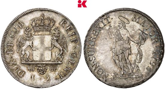 "EUROPÄISCHE MÜNZEN UND MEDAILLEN · ITALIEN, GENUA Republik (Dogi Biennali), 1528-1797. 2 Lire 1795. Sehr attraktives Exemplar mit hübscher Patina, vorzüglich-Stempelglanz. (Italy, republic of Genoa, biennial doges, 1528-1797, two lire of 1795. Very attractive example with handsome patina, extremely fine to uncirculated.)"