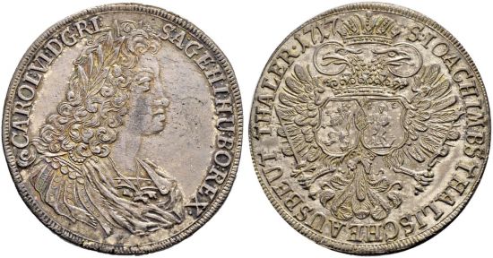 "HOLY ROMAN EMPIRE - AUSTRIA. Karl VI. 1711-1740 Taler 1717. Prag Ausbeute der Grube St. Joachimsthal. Ohne Münzmeisterzeichen. Äusserst seltene Erhaltung, Prachtvolle Erhaltung. Fast FDC. Winzigste Schrötlingsfehler durch die Walzenprägung. In einer Prager Auktion in 2015 wurde so ein Stück als versteigert. Wir sind der Meinung unser Exemplar ist schöner. (Holy Roman Empire, Charles VI, 1711-40, thaler of 1717, Prague mint, for the St. Joachimsthal mines, without mintmaster's initials. Extremely rare conditon. Cabinet piece. About uncirculated, with a few minor flaws from the roller dies. An auction in Prague in 2015 claimed to have the finest known piece but we think this one is better.)"