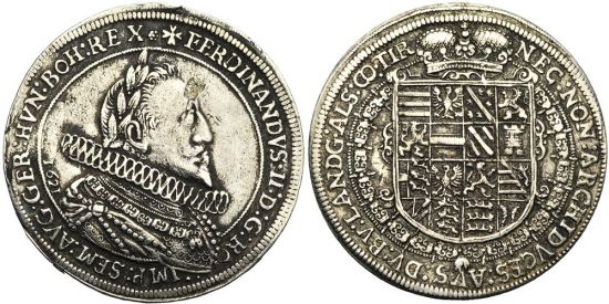 "SAINT EMPIRE, Ferdinand II (1619-1637), AR Taler, 1621, Ensisheim. Au titre de landgrave d'Alsace. D/ B. l., dr. et cuir. à d., avec une grande fraise. R/ Grand écu couronné, entouré du collier de la Toison d'or. Nettoyé. Légers défauts de flan. presque Très Beau. (Holy Roman Empire, Ferdinand II, 1619-37, silvr thaler of 1621, Ensisheim mint, in the name of the landgrave of Alsace. Obverse: laureate, draped, armored and ruffed bust to right; reverse: large crowned arms, Order of the Golden Fleece around. Cleaned, planchet defects, about very fine.)"