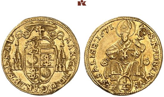 "Max Gandolph von Küenburg, 1668-1687. 1/4 Dukat 1671. GOLD. Sehr schön-vorzüglich. Exemplar der Auktion Bankhaus Partin 10, München 1980, Nr. 85. (archbishopric of Salzburg, Max Gandolph of Küenburg, 1668-87, quarter ducat of 1671. Very fine to extremely fine.)"