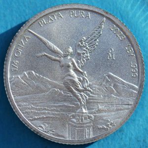 In 1949 the Mexico City mint issued the world's first onza to modest success. It tried again in 1980 with a resurrection of the 1949 design. In 1982 the medallion (technically, Libertads are not coins) was redesigned to use the obverse from the 1921 two pesos. The weight was reduced and the fineness increased from .925 to .999 silver. The medallion was an immediate hit. It was the only silver bullion coin on the market for several years and, backed by the Mexican government, outcompeted private mint issues. It inspired imitations such as the U. S. silver eagle (from 1986) and the Canadian Maple Leaf (from 1988) which have cut into its market share to the point where several of the later dates are downright rare. Fractionals, including this quarter ounce, are much scarcer. The type is recorded for 1996-2013 but is still in production as of 2024.