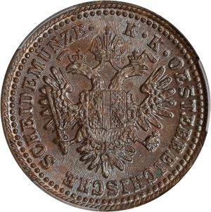 This specimen was lot 74167 in Stack's Bowers Collector's Choice sale (Costa Mesa, CA, February 2024), where it sold for $80. The catalog description[1] noted, "AUSTRIA. Kreuzer, 1851-A. Vienna Mint. Franz Joseph I. PCGS MS-65 Brown. A pleasing Gem, this beautiful minor yields strong details and a soft glittery chocolate brown appeal." This type was struck at several mints (1851-A, B, E, G), The mintage from Vienna is not known but 106,458,000 are recorded from Kremnitz (B). We speculate that this was struck over several years with a frozen date. One convention thaler was 120 kreuzer.