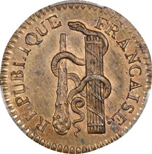 "FRANCE. National Convention. Bronze 10 Centimes Essai (Pattern), Year 3 (1794/5). Paris Mint. PCGS SPECIMEN-63 Red Brown. Plain edge. By A. Dupré. A RARE and enchanting offering, this Choice specimen stands as the finer of just two observed in the PCGS census. Quite alluring, with a good deal of pale red hues present. From the Richard Margolis Collection."