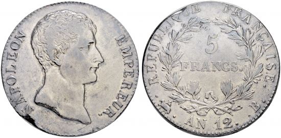 The Rouen mint struck five francs in year 12 of both the Premier Consul type (F.301/11) and the Empereur type (shown here). The An 12-B Premier Consul is scarce and the An 12-B Empereur is rare.