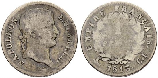 "FRANKREICH, I. Kaiserreich. Napoleon I. 1804-1815. 1 Franc 1813 CL, Genua. Schön. (France, First Empire, Napoleon I, 1804-15, one franc of 1813, Genoa mint. Fine.)"