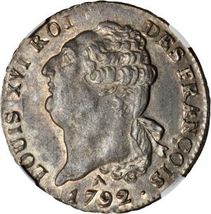 This specimen was lot 30250 in Stack's Bowers ANA sale (Chicago, August 2015), where it did not sell. The catalog description[1] noted, "FRANCE. Ecu, 1792-R. Louis XVI (1774-90). NGC MS-62. Struck at the Orleans mint under assayer Charles-Pierre Delespine. Dividers privy mark. Finest known at the grading services by a 12-point margin. Wonderfully expressive portrait of Louis XVI with a solid strike bringing out nearly all of the detail. Some reverse adjustment marks noted, most prominently across the base of the easel. Attractive even color overall and fully original. It's hard to imagine a nicer example of the coin existing anywhere." This specimen is a "constitutional écu" struck at the Orléans mint, one of a type struck there 1792-93, prior to the trial and execution of the king. Its divisions were the ½, 1/4 and 1/8 écu, struck in billon. The écu was worth $1.10 in the USA before the Civil War. The 1792-A and 1793-A are the most available dates of this scarce type.