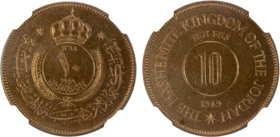 The first specimen was lot 1133 in Stephen Album sale 47 (Santa Rosa, CA, September 2023), where it did not sell. The catalog description[1] noted, "JORDAN: Abdullah I, 1946-1951, AE 10 fils, 1949/AH1368, very rare proof issue with reported mintage of only 25 coins, NGC graded Proof 63 RB, RR."