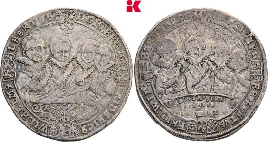 "SACHSEN-WEIMAR, HERZOGTUM, AB 1741 SACHSEN-WEIMAR-EISENACH, AB 1815 GROSSHERZOGTUM Johann Ernst und seine sieben Brüder, 1605-1619. Reichstaler 1612, Saalfeld. Fast sehr schön. (duchy of Saxe-Weimar, John Ernest and his seven brothers, thaler of 1612, Saalfeld mint. About very fine.)"
