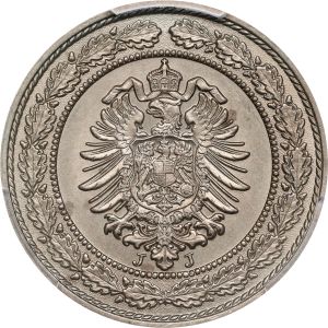This specimen was lot 46801 in Stack's Bowers ANA sale (Oklahoma City, OK, August 2025), where it sold for $85. The catalog description[1] noted, "GERMANY. Empire. 20 Pfennig, 1887-J. Hamburg Mint. Wilhelm I. PCGS MS-64. From the Dr. Michael Vale Collection." This coin is an copper-nickel twenty pfennig from a type issued 1887-88 from the Berlin (mintmark "A"), Munich (mintmark "D"), Dresden (mintmark "E"), Stuttgart (mintmark "F"), Karlsruhe (mintmark "G") and Hamburg (mintmark "J", shown here) mints. The preceding type (KM 5) of 1873-77 was silver. A later type (KM 13), struck 1890 and 1892, had a slightly redesigned eagle. Under the German Empire of 1871-1918, the denominations of two mark and up were permitted for the formerly independent principalities while the lower denominations (one pfennig thru one mark) were minted to a unified design.