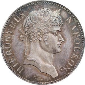 This specimen was lot 42324 in Stack's Bowers ANA sale (Oklahoma City, OK, August 2025), where it sold for $45,600. The catalog description[1] noted, "GERMANY. Westphalia. 5 Franken, 1808-J. Paris Mint. Jerome Bonaparte. PCGS MS-65. An EXTREMELY RARE crown from the reign of Jerome Bonaparte in Westphalia, after being installed by his brother Napoleon, this tremendous Gem glows with electric blue and fiery orange tone, that glitters in the light and catches the eye when held in the light. The surfaces display essentially no signs of mark or handling, with much of the as made dielines evident. An impressive piece from the ever popular period in European history. Ex: CGB (12/2002) Lot # 1435." Jerome was made the puppet king of Westphalia by his brother Napoleon in 1807 and ruled there until French defeats forced his abdication. His reign is remarkable for the issue of the first decimal coinage in Germany, which included this five franken struck to the standard of the franc Germinal. It and the accompanying half, one, two and twenty franks are all rare, altho some of the copper three, five and ten centimes are common in low grade. Most of the region was returned to Hannover, which resumed the issue of the old fashioned pfennige, groschen and thalers.