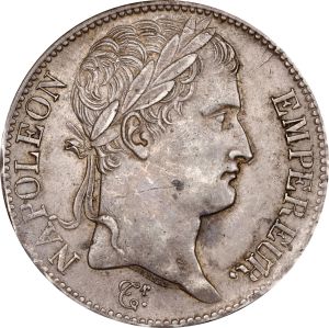 This specimen was lot 71299 in Stack's Bowers Collectors Choice sale (Costa Mesa, CA, September 2025), where it sold for $384. The catalog description[1] noted, "FRANCE. Empire. 5 Francs, 1809-L. Bayonne Mint. Napoleon I. PCGS AU-53. A few adjustment marks and some mottling to the toning are noted, but this more elevated specimen stands as solid representative. From the Richard Margolis Collection (acquired from Stu Witham on 8 September 1970)." Silver five francs were minted throughout Napoleon's reign in large quantities using looted bullion. This type succeeded the "REPUBLIQUE FRANCAISE" reverse struck 1807-08. A complete set of this type comprises 95 date and mintmark combinations, some very rare. This date is not priced better than TTB (Extremely Fine) in Le Franc. The entire production run totaled about 127 million pieces. All silver five francs were officially recalled in 1928 but ceased to circulate after World War I. This coin was legal tender in the United States until 1857 at a value of 93 cents.