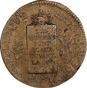 This specimen was lot 43205 in Stack's Bowers ANA sale (Oklahoma City, OK, August 2025), where it sold for $192. The catalog description[1] noted, "FRANCE. National Convention. Bell Metal 2 Sols, Year II/1793-I. Limoges Mint. PCGS VF-35. Struck upon a stunningly thick and overweight planchet, this example weighs over twice what would otherwise be expected for the type. Rather extensively circulated, as is evidenced by its honest wear across both sides. From the Richard Margolis Collection (acquired from Schulman in 1952 for $10). Ex: Howard D. Gibbs Collection (Hans Schulman - 10/1952) Lot # 101." This coin was minted at Limoges during the throes of the Revolution. 1793 was the year the king was tried and executed. Amid the chaos, large quantities of these copper two sols were issued, along with six and twelve deniers (¼ and ½ sols). The 1791-93 issues bear the bust of the king but his ouster forced the removal of his portrait. The obverse shows the tablet of the law with the motto, "LES HOMMES SONT EGAUX DEVANT LA LOI," (all men are equal before the law) and the reverse shows the balance scales of justice. This type was hurriedly and crudely made and is rarely found better than Very Good.