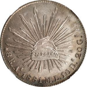 This specimen was lot 70290 in Stack's Bowers Collector's Choice sale (Costa Mesa, CA, May 2023), where it sold for $288. The catalog description[1] noted, "MEXICO. 8 Reales, 1881-As ML. Alamos Mint. NGC UNC Details—Cleaned. This decently preserved example boasts a strong strike with lustrous satiny surfaces. Attractive light mottled patina with richer coloration near the edges adds to its pleasing appearance. Close inspection reveals evidence of a light past cleaning, now subdued and attractive. Despite its shortcomings a handsome example of the date." The Alamos mint in Sonora began striking eight reales in 1864. The early issues are rare but become more common after 1873. The 1881 is common. The mint was closed in 1895 along with Chihuahua, Durango, Guadalajara and Hermosillo. Oaxaca and San Luis Potosi were closed in 1893.