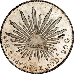 This specimen was lot 2815 in Ponterio sale 164 (New York, January 2012), where it sold for $391. The catalog description[1] noted, "MEXICO. Zacatecas. 8 Reales, 1892-ZsFZ. PCGS MS-64." The Zacatecas mint struck eight reales 1825-97 and is one of the abundant mints for that denomination; this date is common in all grades. An 1892/1 overdate is recorded.
