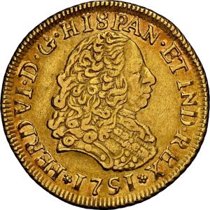 This specimen was lot 1238 in Sedwick Auction 37 (Winter Park, FL, May 2025), where it sold for $13,200. The catalog description[1] noted, "PERU, Lima, gold bust 2 escudos, Ferdinand VI, 1751 J, first bust, rare, NGC AU 50, ex-Almenara. Broad flan with choice rims, good luster and faint toning, light honest wear only, rare and desirable first date of issue for which none appear in MS grade at NGC. Pedigreed to the Almenara Collection." This type was struck 1751-53 and all dates are rare. The Mexico City mint used a different bust.