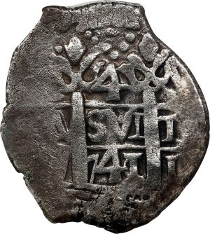 This specimen was lot 72055 in Stack's Bowers Collectors Choice sale (Costa Mesa, CA, November 2022), where it sold for $2,100. The catalog description[1] noted, "PERU. Cob 4 Reales, 1741/0-L. Lima Mint; Assayer Fernando de Vargas (V). Philip V. PCGS Genuine--Salt Water Damage, EF Details. This overdate Lima cob is remarkably well-preserved and attractive considering that it suffered saltwater damage. This coin's surfaces offer two denomination marks, a clear date, and identifiable fragments of the mintmark and assayer's initial. The curve of the digit '0' is rather obvious behind the '1', adding to the appeal of this attractive piece. From the Pat Johnson Collection. Privately purchased from Mike Dunigan." Four reales of this type were struck through the reign of Philip V. Assayer de Vargas stamped his coins 1739-48. In 1728, the silver cobs were debased from 0.931 fine to 0.917 fine with no change in design. The Mexico City mint was converted to milled coinage in 1732-34 but Lima would not follow suit until 1751.