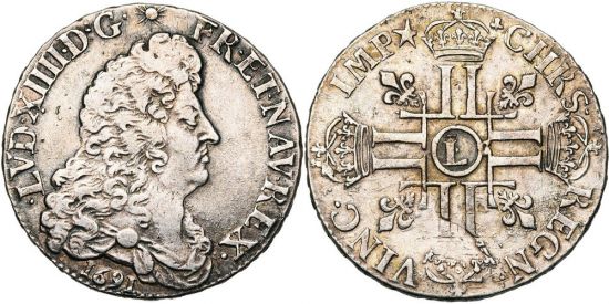 "FRANCE, Royaume, Louis XIV (1643-1715), AR demi-écu aux huit L, 1691L couronné, Lille. 1er type. 1e réformation. D/ B. dr. à d. R/ Croix formée de huit L couronnés, cantonnée de quatre lis. Très Beau. (kingdom of France, Louis XIV, 1643-1715, silver half écu of the eight "L's" of 1691, crowned L mintmark, Lille mint, first type, first reformation. Obverse: draped bust right; reverse: cross formed of eight crowned "L's", cantonned with four lilies. Very Fine.)"