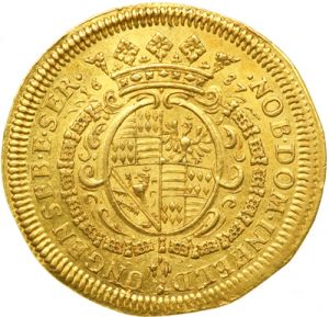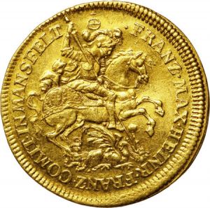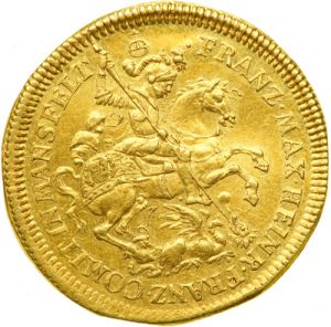 The first specimen was lot 4029 in Goldberg sale 41 (Beverly Hills, May 2007), where it did not sell. The catalog description[1] noted, "Mansfeld. Ducat, 1687. Franz Maximilian and Heinrich Franz, 1644-1692. Obv. St. George slaying the dragon. Leg: .FRAZ.MAX.HEINR.FRANZ.COMITIN MANSFELT Reverse: Crowned arms within chain of the Golden Fleece. Leg: .NOB.DOM.INHELD -- UNGEN.SEB.E.SER. NGC graded AU-55. Mansfeld is an example of how an ancient noble family can be ruined by hereditary divisions. The original Mansfeld, located north of Saxony, stems from the eleventh century. Yet the county was subdivided so many times, that it lost its power and prestige. Located in the Harz Mountains, large deposits of silver produced tremendous numbers of silver coins, but few gold ones. This is a tough coin to find." The second specimen was lot 30081 in Heritage sale 3029 (New York, January 2014), where it sold for $3,055. The catalog description[2] noted, "Highly Artistic Type Mansfeld-Bornstedt. Franz Maximilian & Heinrich Franz gold Ducat 1687, AU58 NGC. One-year type. A wonderful illustration ducat with a skilled rendering of Saint George on horseback slaying a dragon on the obverse, and crowned arms encircled by the Order of the Golden Fleece on the reverse. A rather desirable example, this coin has bright orange-gold surfaces and above-average central definition as a result of the penetrating strike. Ideal for the ducat collector, or even perhaps even the British collector that finds interest in the paralleled imagery." The next ducat (Fr-1574) was issued in 1747.