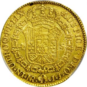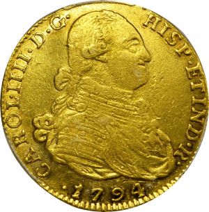 This specimen was lot 11346 in Stack's Bowers NYINC sale (New York, January 2018), where it sold for $960. The catalog description[1] noted, "COLOMBIA.1794-JJ 4 Escudos. Santa Fe de Nuevo Reino (Bogotá) mint. Carlos IV (1788-1808). EF-45 (PCGS). Even light yellow gold with some remaining luster in protected areas. From the Eldorado Collection of Colombian and Ecuadorian Coins. From Kurt Spanier, December 1980." This specimen is one of a type struck at Nuevo Reino (Bogotá) 1792-1807 and at Popayan in 1792-98 and 1801. The Colombian mints (Popayán and Nuevo Reino) concentrated on minting gold, to the near exclusion of the silver which predominated at the other colonial mints. While one escudos and eight escudos are plentiful, four escudos are rare. Assayer JJ is recorded for 1772-1809.