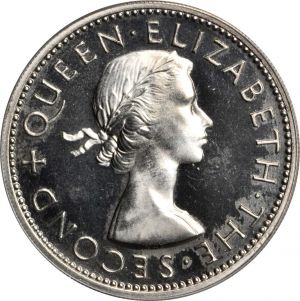 This specimen was part of lot 22974 in Stack's Bowers ANA sale (Anaheim, CA, August 2016), which sold for $329. The catalog description[1] noted, "RHODESIA & NYASALAND. Partial Proof Set, 1955. ICG PROOF-63 CAMEO to PROOF-66 DEEP CAMEO. KM-PS2. 5 pieces in set. Mintage of 2,000 pieces each. A fairly scarce set and with fabulous designs to the reverses. The 2 Shilling and Half Crown are PROOF-66 CAMEO and DEEP CAMEO respectively, and these coins alone make this partial set extremely desirable given their spectacular all white state of preservation. The balance of the set is attractive as well, with all of the coins exhibiting at least some cameo affect. No spots, with a few of the smaller denominations showing light haze. Missing the bronze 1/2 Penny and Penny coins from the set." The Federation of Rhodesia and Nyasaland was a shortlived grouping of the British colonies of Northern Rhodesia (now Zambia), Southern Rhodesia (later Rhodesia, now Zimbabwe) and Nyasaland (now Malawi). Formed in 1953, it was very much a shotgun marriage, the black-dominated Northern Rhodesia and Nyasaland wanting to have nothing to do with white-dominated Southern Rhodesia. Zambia and Malawi left in 1964, and Rhodesia declared independence in 1965, terminating the federation.